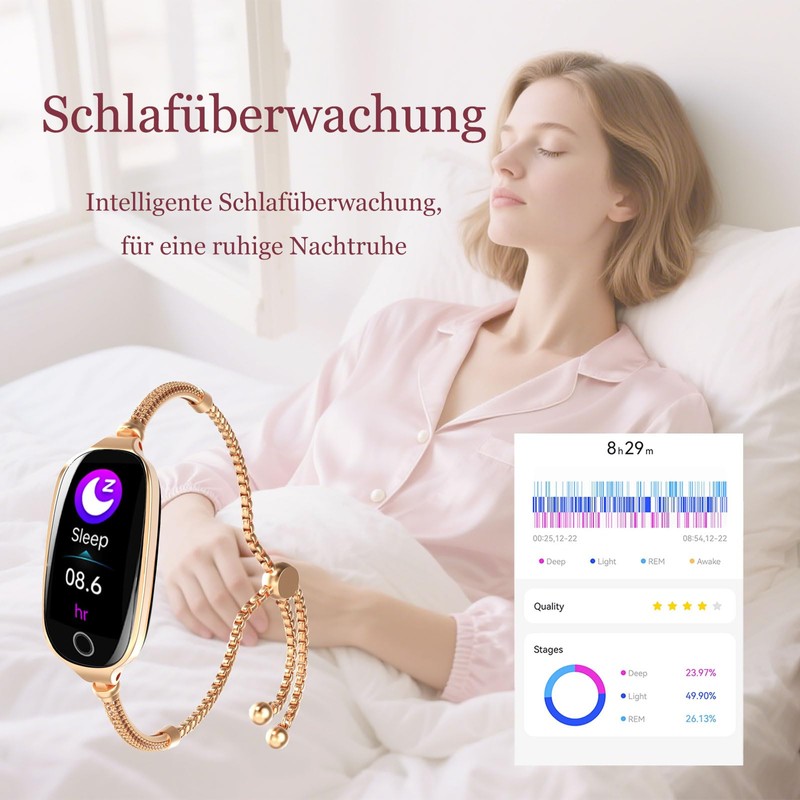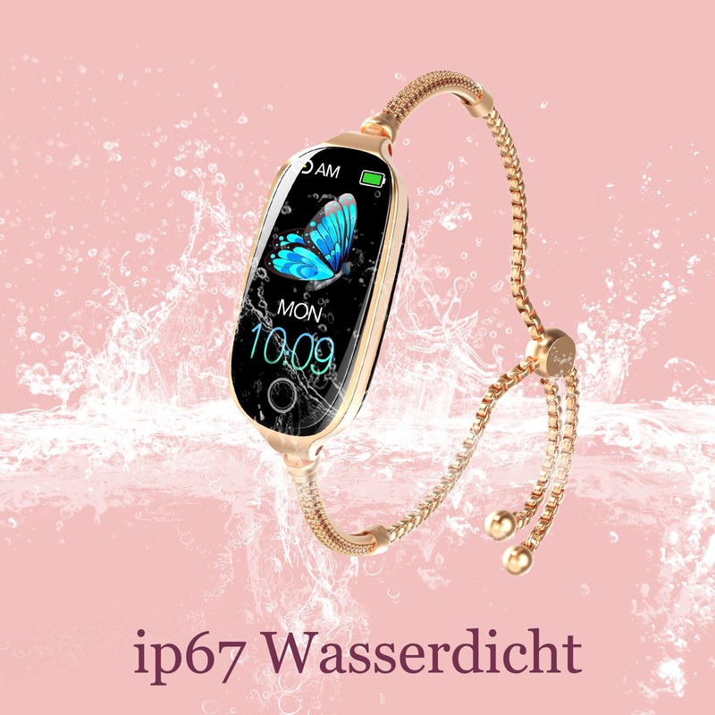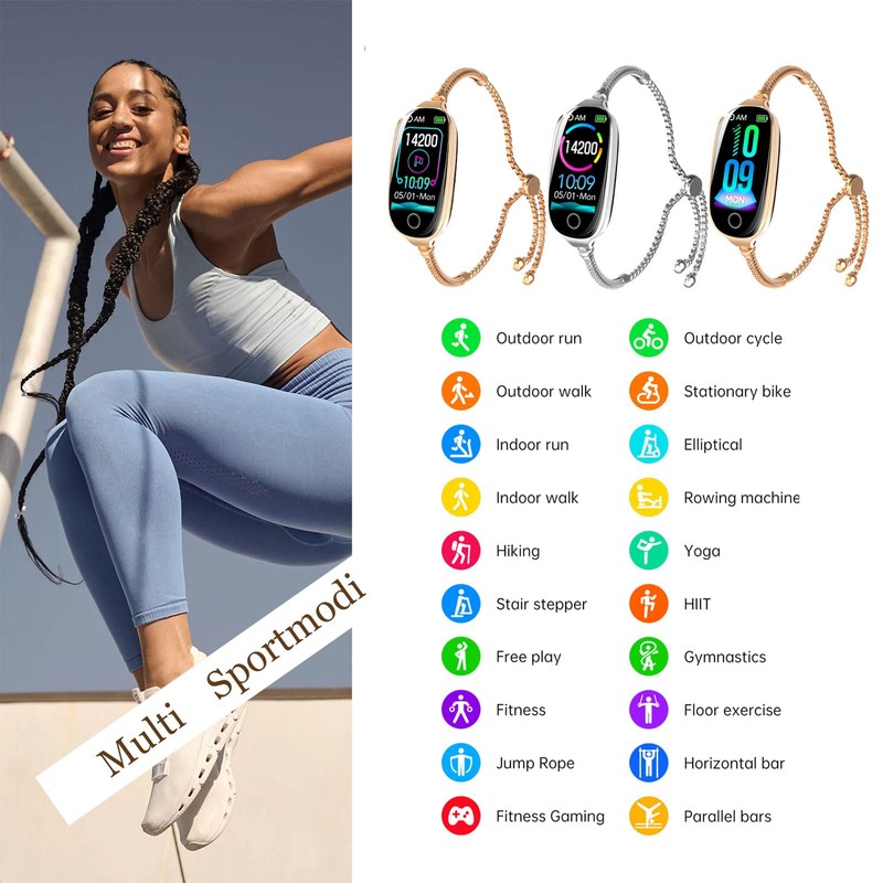 - This women's smartwatch impresses with its slim design. The delicate metal bracelet in gold or silver, combined with the sparkling details, makes it a real eye-catcher, give it a luxurious charm that impresses not only as a functional device, but also as a fashionable accessory