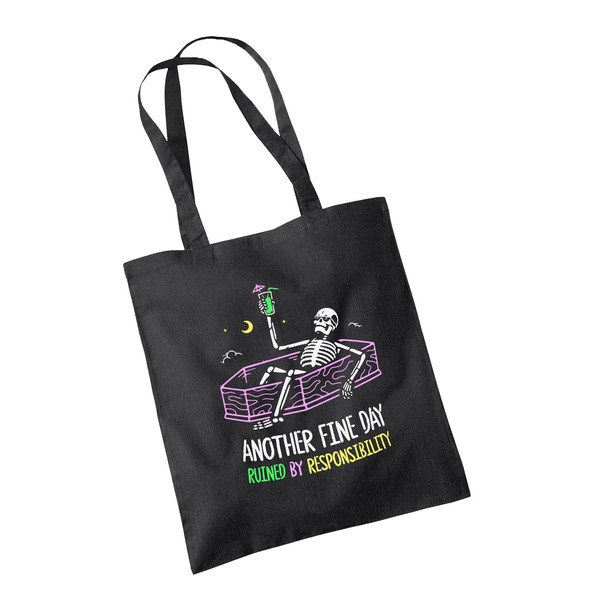 - Another Fine Day Ruined Black Tote Bag Cotton Shop - Skull Skeleton Coffin Holiday Chill Cool Goth Dark Rock Roll Punk Scene Emo Sunglasses Teen Adult Gift Present