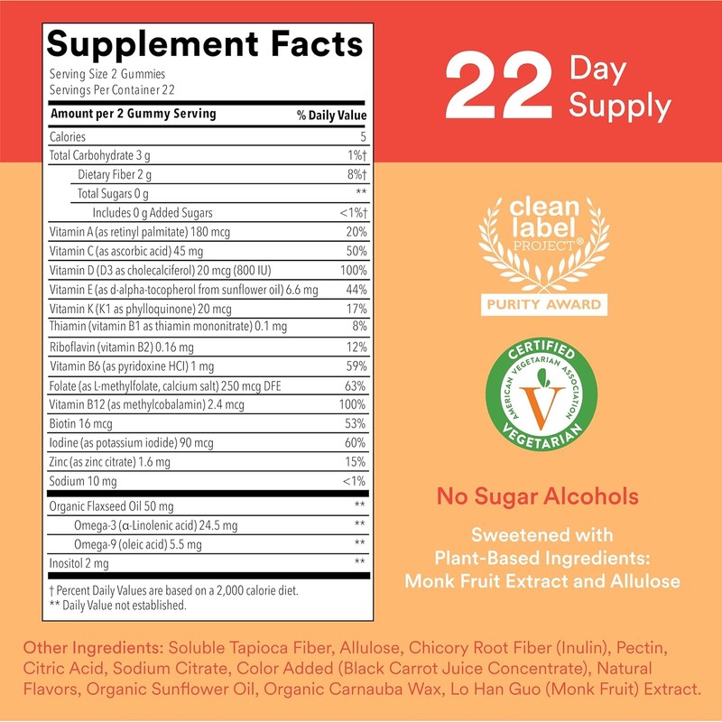 16 Essential Nutrients for Growing Bodies: Includes vitamins C, D3, K, A, methylated folate, and vegetarian Omega-3 ALA, offering a daily dose of both multivitamins and omegas in a tasty serving.