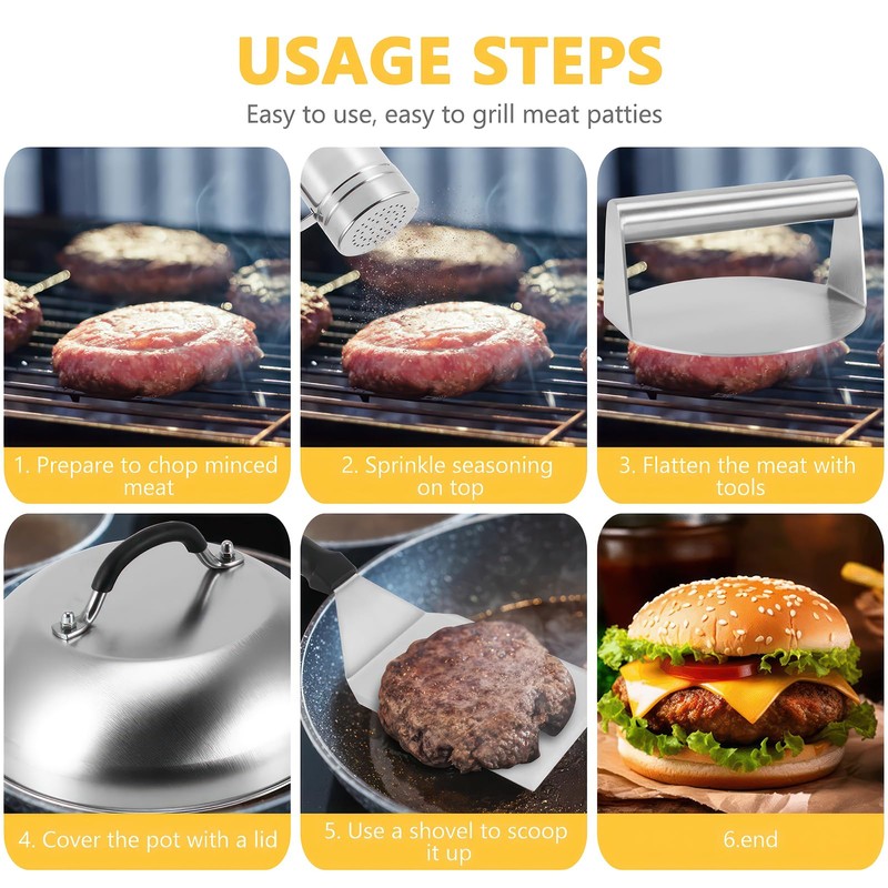 • 【FULL SET OF GRILLING ACCESSORIES】: This burger press kit has comprehensive grilling tools - including 1 burger smasher, 1 burger spatula, 1 spice shaker and 1 round melting dome. Make perfect SMASH burgers at home.