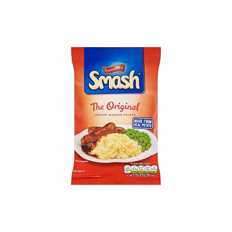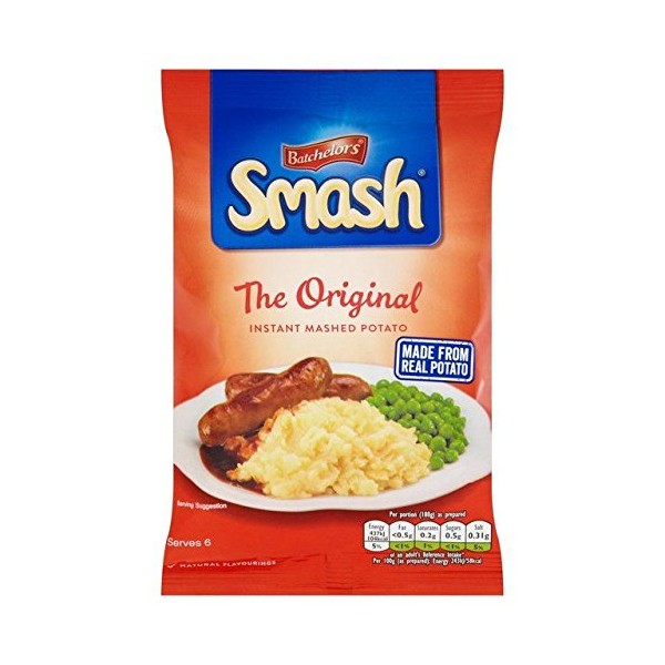 Instant Mash Potato Smash. We've selected and graded the finest quality potatoes to make our Smash instant mash potato. Every potato is peeled and steam cooked to keep its natural flavour. We then dry them to make convenient, light and fluffy 'Smash' potato flakes. We haven't added any artificial colours or flavours and Smash is gluten free, lactose free and suitable for vegetarians. Ideal as an accompainment to any meal or as a topping on a shepard's or fish pie, Smash is also the perfect store cupboard solution - great for any mash potato based recipe like fish cakes or hash browns. Quick and easy to prepare, Smash is simple the best instant mash on the planet - just like home-made! This pack contains 6 servings.