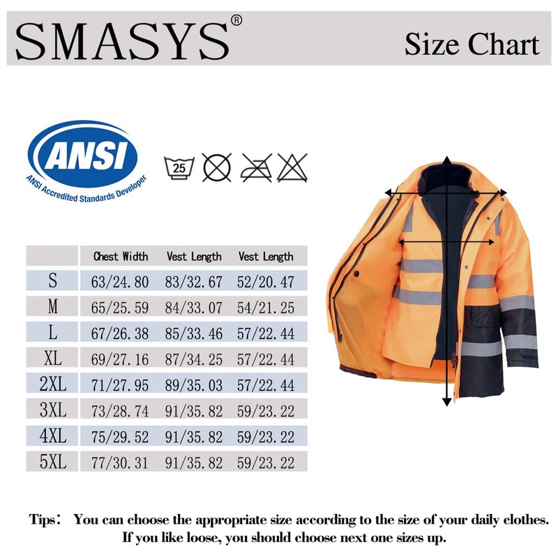 - 【APPLICATIONS & SERVICE】The jacket size is suitable for a wide range of people, with S/M/L/XL/2XL/3XL/4XL/5XL available. Men and women construction, traffic control, utility workers, surveyors, forestry workers, and school crossing guards. In the field, rain, and alpine temperatures the two-piece jacket is very suitable. SMASYS is always committed to providing high-quality safety and protection for your work and life. If you have any questions about our products, you can contact us at any time.