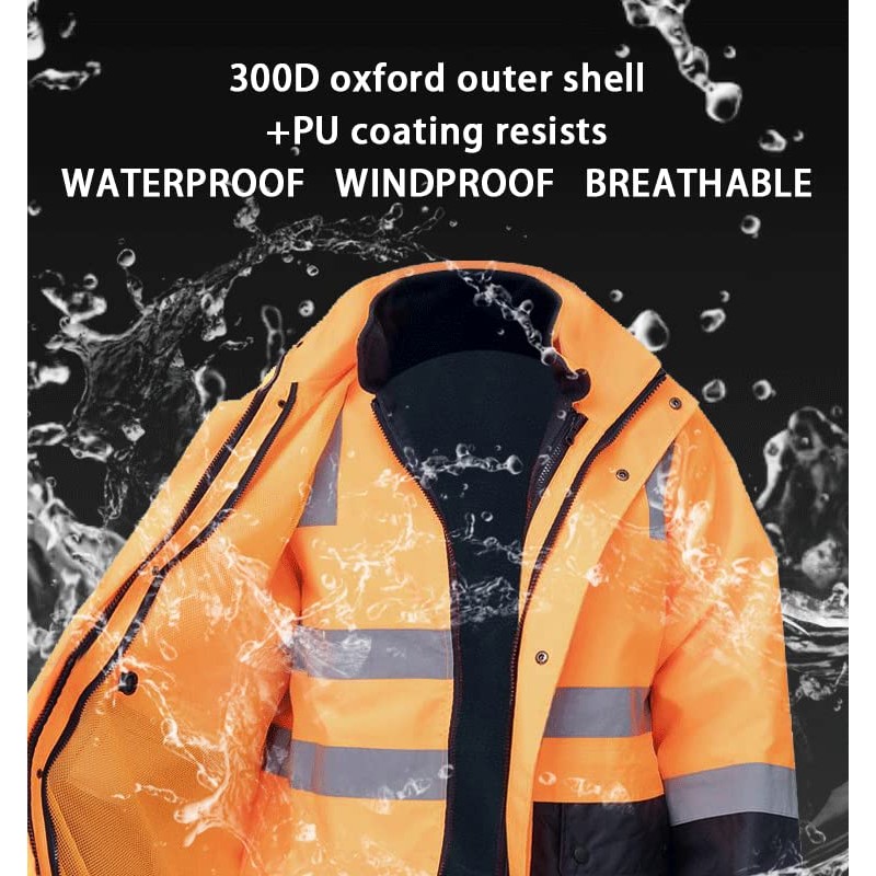 - 【FABRIC & MATERIALS】The two-piece safety clothes include a thin safety jacket and a thick safety jacket. The thin safety jacket lining is made of polyester taffeta and it has an adjustable drawstring inside the waist, which can be tightened to keep you warmer and slim your waistline. The thick safety jacket has a shell fabric made of 100% polyester 300D Oxford fabric+ PU coating and a lining made of fleece, comfortable and warm.