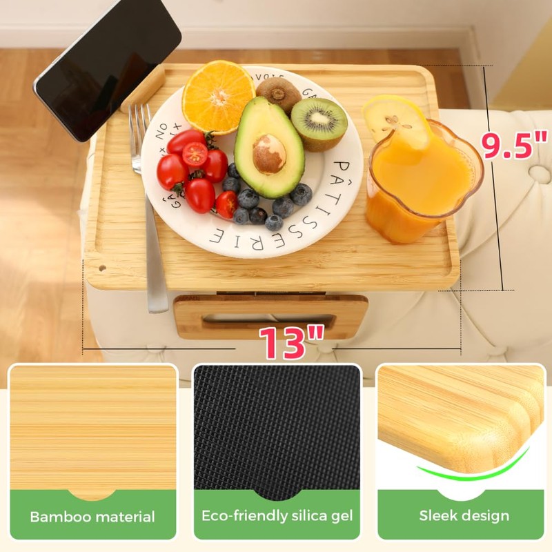 - 🏠【HOME ESSENTIALS】Newly upgraded bamboo sofa clip table, suitable for 3.5”-14” sofa, with multi-tasking and scene use, support 180-degree wide arm extension, can be used as a common fruit plate or food tray on the table. And it can be placed on the left or on the right according to your usage habits. Multifunctional sofa clip table, this is the perfect choice.