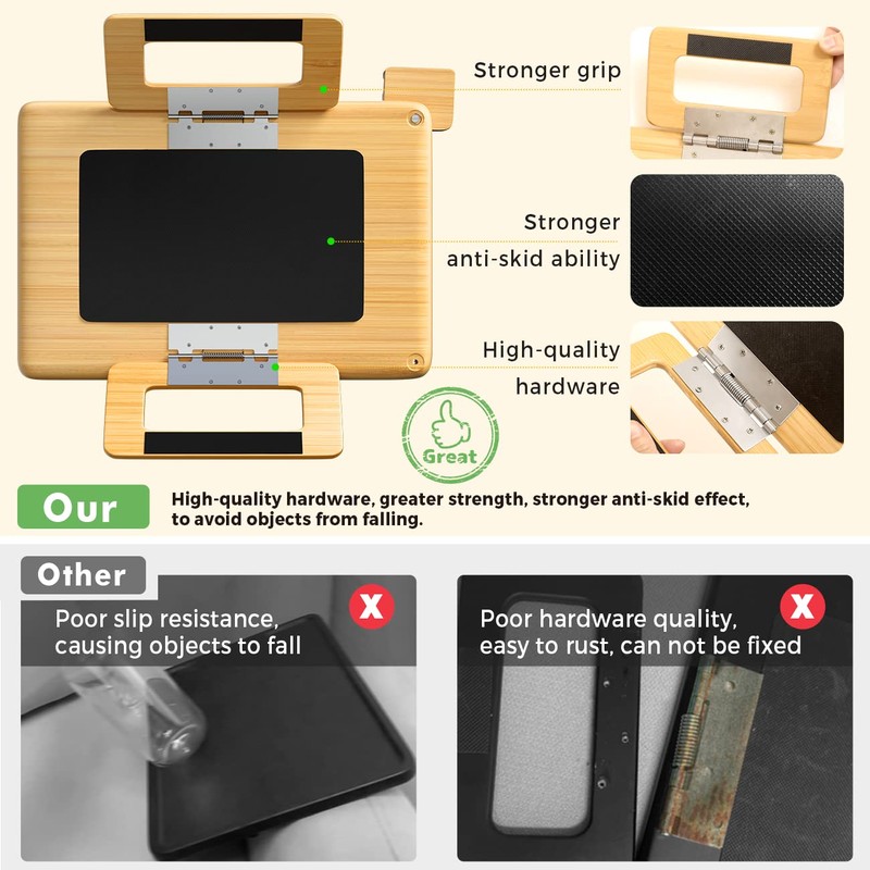 - 📃【PATENTED TECHNOLOGY】360-degree rotation of the phone/tablet stand, adjust the best viewing angle while avoiding the encroachment of the placement space like other brands of trays. A non-slip pad is installed in the groove to protect the screen and make it more stable, and it can be used directly without removing the phone case. The folding table legs are designed to take up no space at all. It can be fully retracted under the sofa in just 3 seconds.