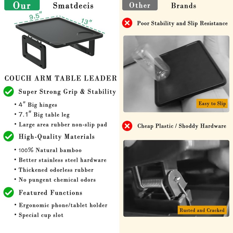 - Super Strong GripWe use better high-quality stainless steel hinges, it has a 4" length that is nearly double the length of other couch arm table tray's hinges, making the tv tray super stability, stronger grip, firm like a sofa side table, solid durability is 10x more than ordinary couch tray (couch cup holder). Meanwhile, a large area of the new generation of odorless rubber non-slip pads enhances stability while keeping pungent chemical odors away. Enjoy a healthy life!