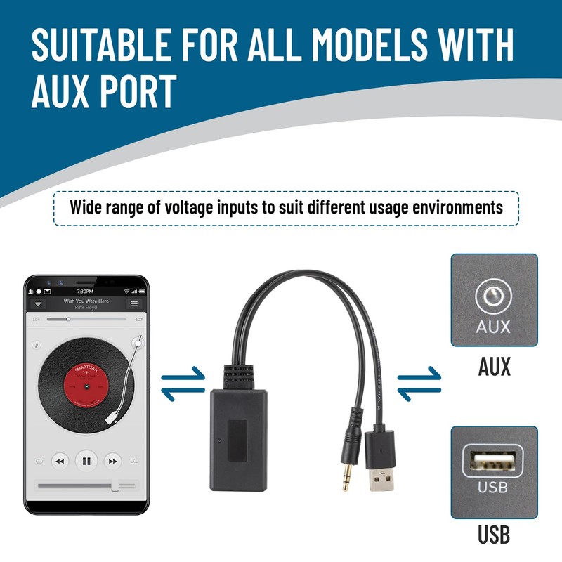 - General accessories: This bluetooth aux adapter car has strong versatility, all models with AUX interface are applicable, for different brands of vehicles, according to the interface reserved behind the original car host, equipped with different connectors to plug and unplug.