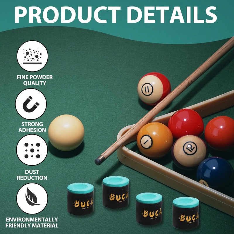 - 【Chalk Parameters】The snooker chalk set contains 4 carefully crafted Lightgreen chalks, and each square of billiard chalk measures 2.2x2.2x2.5cm (0.86''x0.86''x0.98''), which is perfect for you to apply powder to your billiard cues. The unique inward-concave hemisphere evenly and comprehensively covers the billiard cue head, providing smooth application and better performance in intense competitions, making it your great snooker accessory.