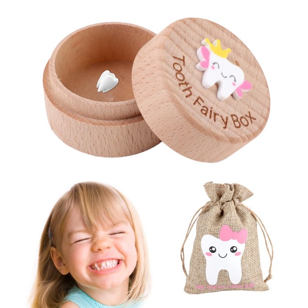 SMCEHEYA Tooth Storage Box 2Pcs Tooth Fairy Bag Tooth Keepsake Box Wooden Tooth Fairy Pouch Baby Teeth Holder Cute Tooth Fairy Gift for Tooth Loss Baby Birthday Girl and Boy(Storage Box + Storage Bag)