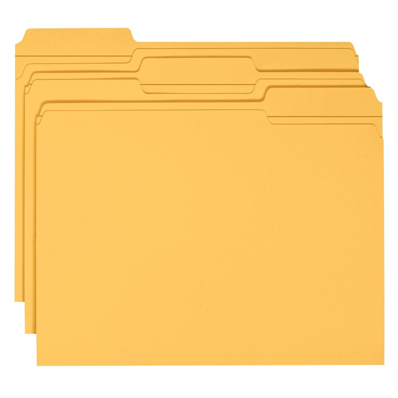 Organize your files beautifully with color coordinated filing, making it easy to find the documents you need when you need them. A perfect solution for everyday filing needs, Smead’s Colored File Folders with Reinforced Tabs are designed to keep your desktop or drawer filing system tidy. Your office filing can achieve better organization with fewer lost and damaged documents when you incorporate a color-coded filing system in your office. Match your office scheme with color coordinated files in fashionable colors. Includes 100 letter size folders (11-5/8" W x 9-1/2" H overall, 9" H body) in goldenrod with a 1/3-cut tab for printed or handwritten labels. Two-ply reinforced tabs provide extra strength where you need it most, making these top tab file folders a perfect choice for frequently accessed files and important papers. Durable 11 point stock folders are scored for 3/4” expansion. Improve filing efficiency when you can find exactly what you need at your fingertips and bring order to your household and office with our colorful filing solutions. Proudly made in the USA, these sturdy file folders contain 10% recycled content, 10% post-consumer material and are SFI Sourcing Certified. • A Rich Heritage of Innovation and Quality. A world-leading provider of solutions for efficient document management, Smead is a woman-owned company well-known for its high quality, environmentally responsible products and innovative organizational systems. For more than a century, Smead has been committed to one purpose: Keeping You Organized!