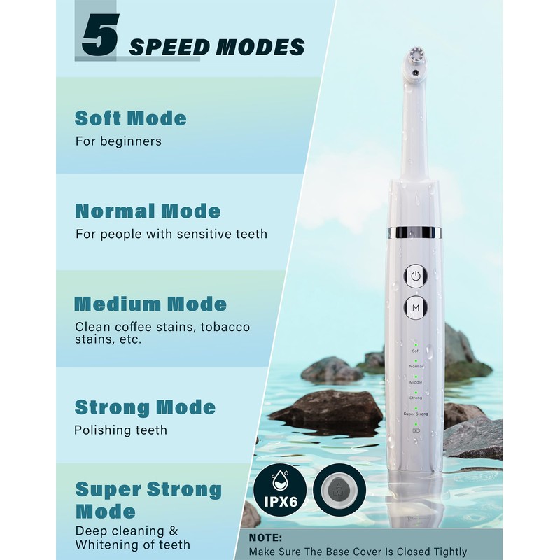 • 5 Speed Modes & IPX6 Waterproof - The teeth cleaning kit has Soft, Normal, Middle, Strong, and Super strong modes with a low-noise and low-vibration design, making it easy for you to choose a comfortable mode according to the severity of the stain on your teeth. IPX6 waterproof allows washing the head under water. Tips: 1)Please choose soft mode when you use it for the first time. 2)Please don't soak the machine body in water, please clean it with a damp cloth to wipe