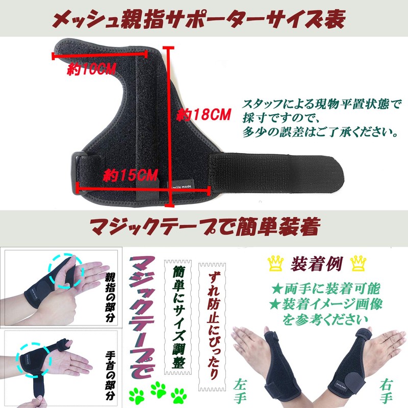 • ✅【マジックテープで簡単装着・肌にあたっても痛くないバンド使用・フリーサイズ・左右兼用】 smile modeメッシュ親指サポーターは、マジックテープで簡単に脱着可能です。 親指の部分と手首の部分をバックルで調整できますので、自分に合うように調整しやすく、ずれを防止してぴったりとフィットします。装着時のご注意点について、ご紹介させていただきます。親指部分のバンドが親指の爪先に合うようにご着用をお願いいたします。親指と人差し指の間のくぼみに合わせて装着した場合、親指部分のバンドがくぼみにあたったり、金属プレートの位置がずれて手にあたり痛くなる可能性があります。親指が長い方は、つける位置を調整しながらご使用ください。手首のバンド部分はさらっとした生地を採用しているので、付け心地よく、お肌にも優しいです。smile modeメッシュ親指サポーターは左右兼用なので、一つ持ってれば、両手に使え超お得でおすすめです。