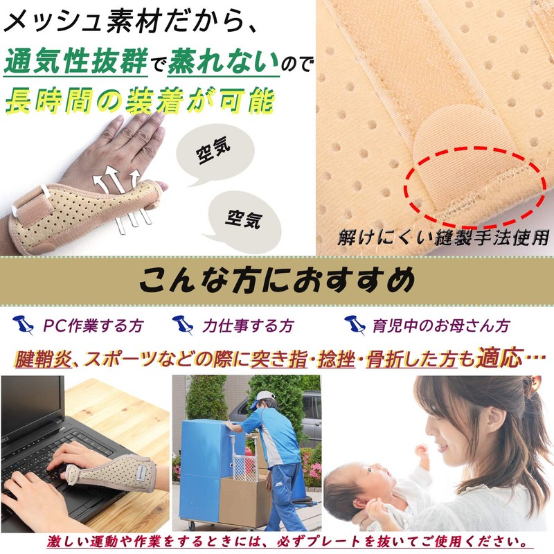 • ✅「親指サポーター しっかりタイプ 2種類プレート」は「親指サポーター スリムタイプ 1種類プレート」と比較すると、金属プレートは1種類しかありません。プレート使い分けの面倒は要りません。スリム装着できます。 smile mode親指サポータは通気性に優れたメッシュ素材を使用。汗でも蒸れないので、夏場や長時間の使用でも快適にご使用いただけます。また、縫製もしっかりしているため、縫い目破れなどの心配もなく丈夫で長持ちします。独自の縫製手法を用い、糸ほつれ防止で返し縫いをしていますので簡単に解けません。