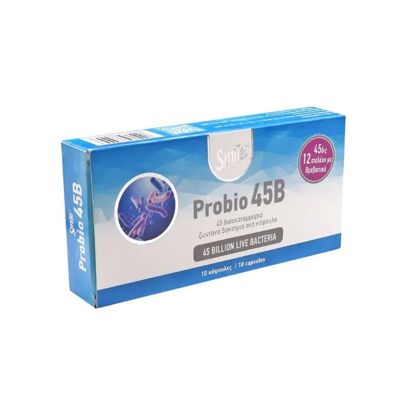 Smile Probio 45B is a specialized dietary supplement that contains a powerful blend of 12 probiotic bacterial strains, totaling 45 billion CFU per daily dose, designed to support normal intestinal function and the balance of the gut microbiota. It also contains prebiotic ingredients such as tapioca dextrin, inulin, and xylo-oligosaccharides (XOS) that promote the growth of beneficial bacteria in the gut.