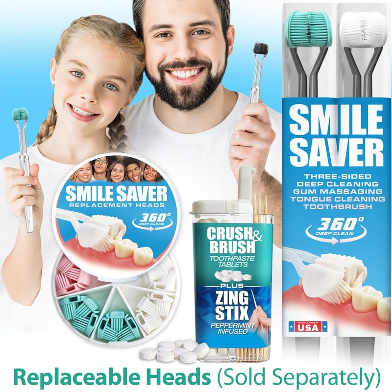 - REPLACEABLE HEADS ✨ The SMILE SAVER 360° 3-Sided Toothbrush features eco-friendly and cost effective replacement brush heads (sold separately) and reusable handles. The ideal oral care alternative for those looking to reduce their environmental impact while maintaining a healthy smile.