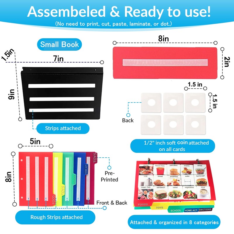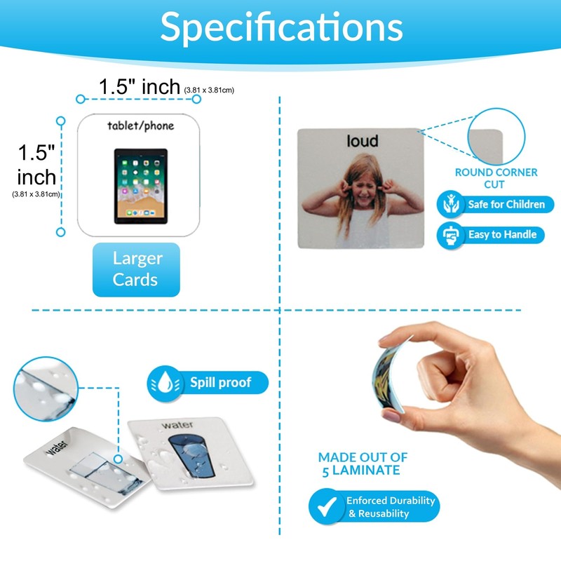 - Durability : The small 1.5x1.5" or large 2x2" cards are crafted from durable materials, either 5-mil hot laminated sheets on 110lb cardstock or sturdy plastic, making them reusable and long-lasting. The picture communication cards are widely used by teachers, parents, caregivers, and therapists in homes, centers, and schools.