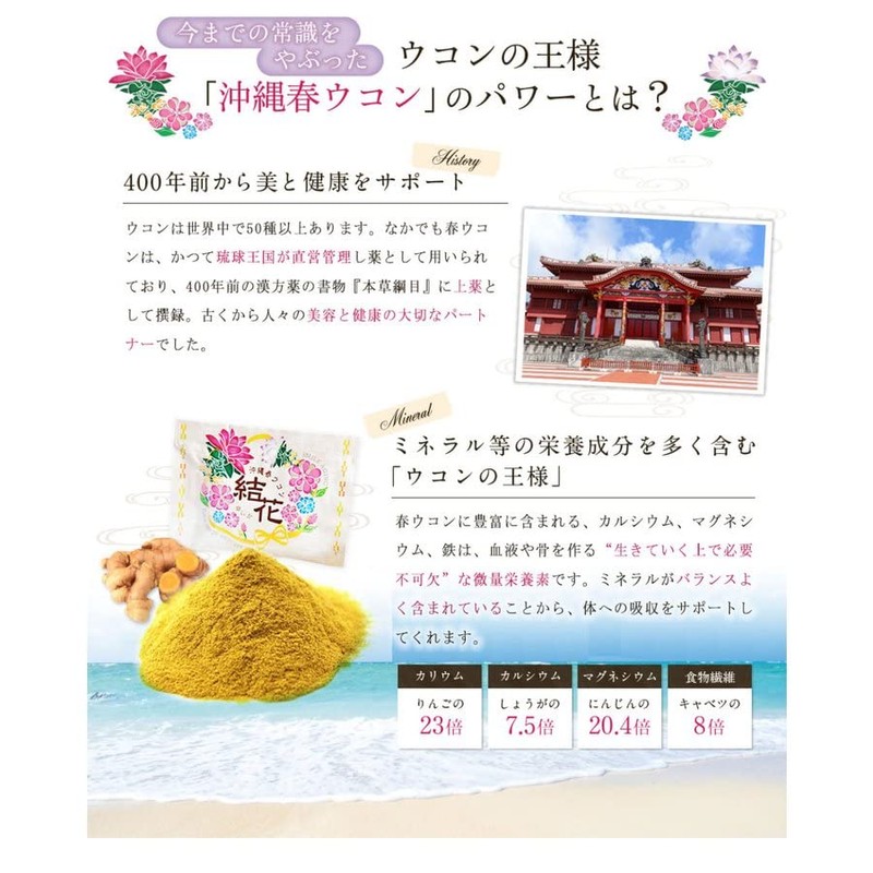 - 【4種類のウコンを使用】 ■春ウコン 豊富な精油成分が特徴で、ミネラルや食物繊維も多く含まれています。 ■秋ウコン お酒を飲むときに注目されるクルクミンを含んだウコン。その秋ウコンを品種改良し秋ウコンと比べるとクルクミンが3.3倍(※)含まれている「沖縄皇金」を使っています。 ■紫ウコン 4種類のウコンの中でも特に苦みが強くて、根っこの断面が紫色を帯びていることから紫ウコンと呼ばれています。 ■白ウコン 希少価値が高く、あまり流通されておらず、新しい可能性をもつウコンと言われています。
