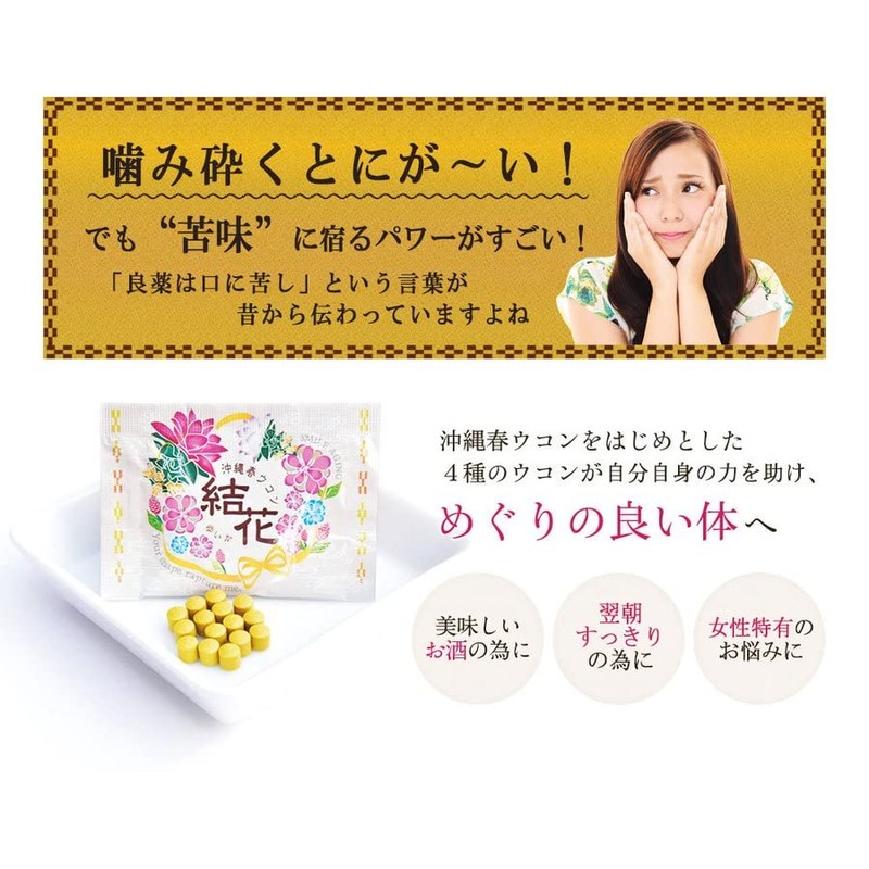 - 原材料名:春ウコン、乳糖(乳由来)、沖縄皇金(秋ウコン)、紫ウコン、硬化ナタネ油、ハナショウガ(白ウコン)/セルロース、ショ糖、脂肪酸エステル、シェラック
