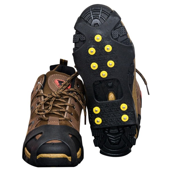 smilefoot 靴底 アイゼン 10本爪 2個セット スノースパイク 滑り止め アイススパイク 軽量 かんじき 靴底用滑り止め 登山 通勤 釣り 雪 トレッキング ハイキング 氷結路面 転倒防止 スニーカー パンプス ローファー 革靴 ブーツ 左右兼用 (黄釘, L)