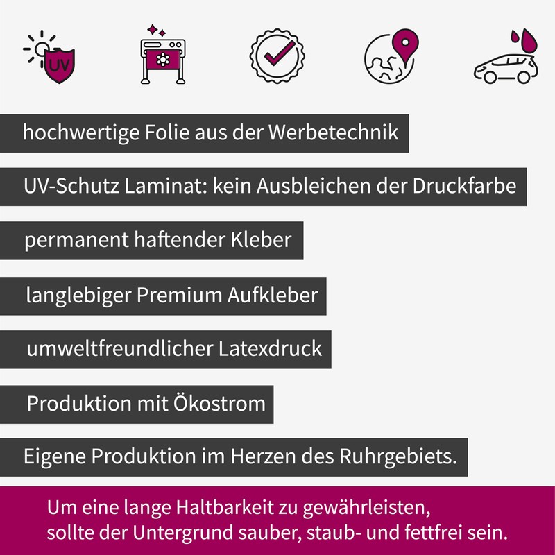 Drinnen und draußen ein echter Blickfang. Das Material ist abwischbar versiegelt, Waschanlagen geeignet, UV- und witterungsbeständig, sowie vergilbungsfrei. Der Aufkleber bleibt Ihnen somit lange schön erhalten. Beste Haftung auf glattem und sauberem Untergrund.