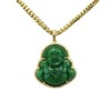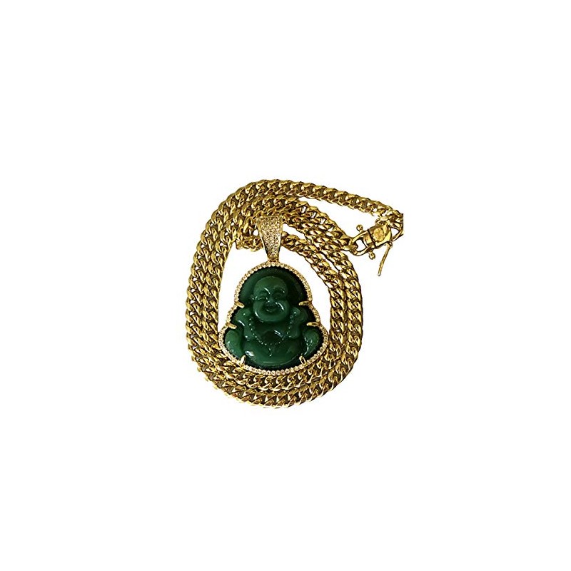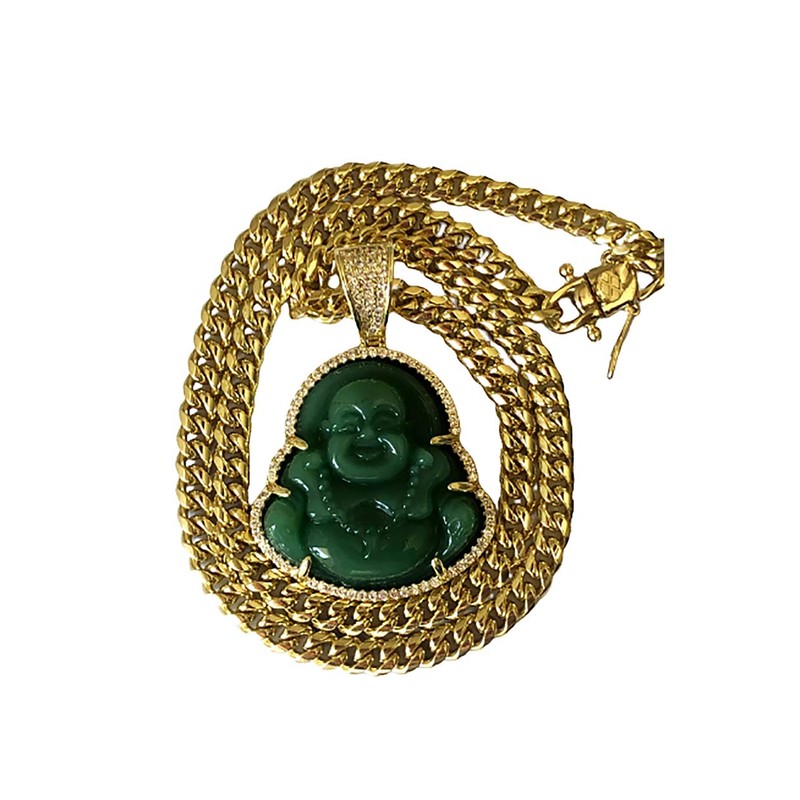 Smiling Happy Iced Laughing Buddha Green Jade Pendant Miami Cuban Chain Box Lock, Genuine Certified Grade A Jadeite Jade Hand Crafted, Jade Buddha Chain, 6mm 22" Miami Cuban Choker Chain Necklace