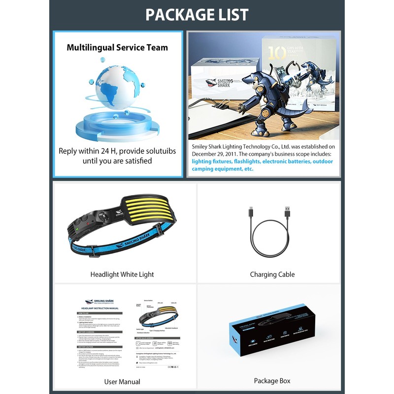 Smiling Shark Rechargeable Headlamp, 230°Wide Angle 6*White Light The Brightest LED Head Lamp with Motion Sensor Waterproof Headlight for Camping Hiking Outdoor, Head-Lamp-LED-Frontale-Rechargeable