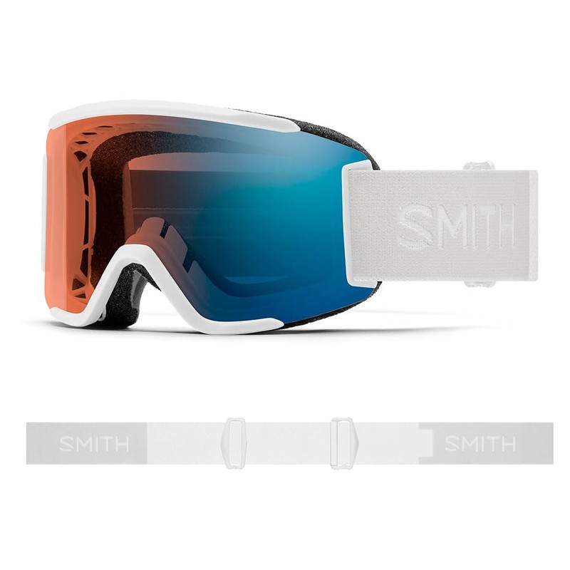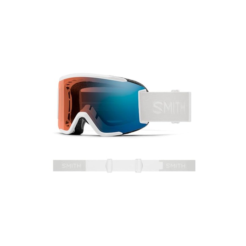 The Smith Squad S ski goggles for adults have the following features: The Smith Squad S ski goggles for adults are modern ski goggles with a self-tinting lens that always allows a good view of the slopes. Specifications: Fit: slim fit; responsive fit frame conforms to the face; dual layer Dri-Wix foam ensures a good hold of the glasses on the head; the headband is adjustable ventilation: cylindrical lens with airflow ventilation system prevents fogging on the inside of the lens; Fog-X anti-fog coating lens category: self-tinting Carbonix-X ChromaPop Pro Photochromic Blue Mirror lens category 1-3 (Light transmittance 16-55%); for cloudy and sunny weather. Colour: white - blue. Material: plastic