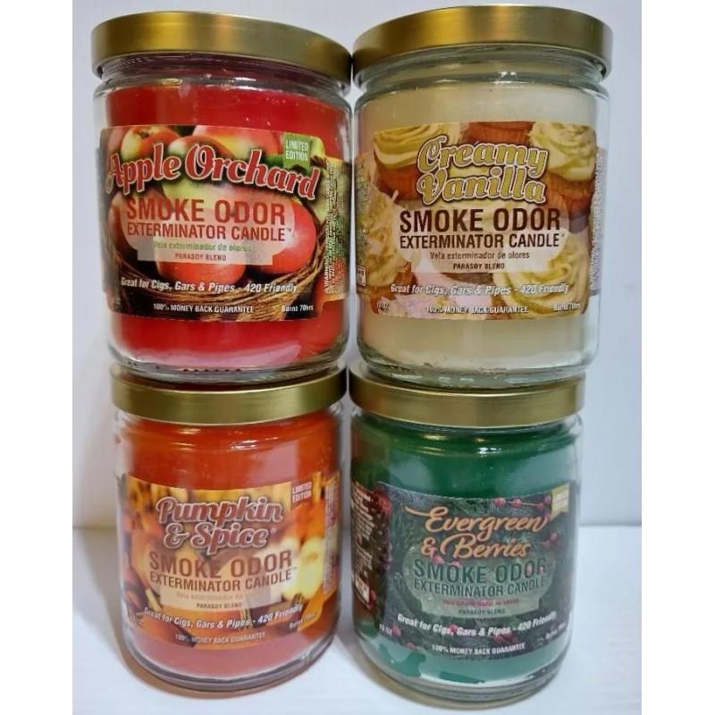 Smoke Odor Exterminator 13 oz Jar Candles Apple Orchard, Assorted (4) Includes Apple Orchard, Creamy Vanilla, Evergreen & Berries and Pumpkin & Spice. This set of candles burns approximately 70 hours each and is made in the USA This variety pack pick by buyer?s reviews and made perfect assortment for eliminate the odor from your place.
