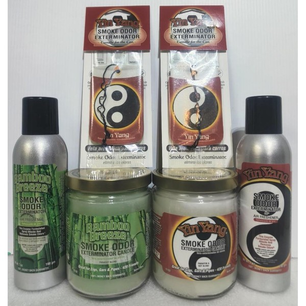 Smoke odor Exterminator Bamboo Breeze, Includes Two 13 oz Jar Candle Two 7 oz Spray & Two Car Hangers All in One Bundle.