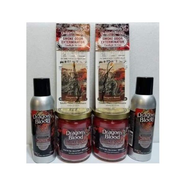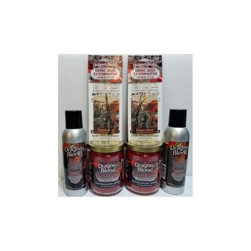 Smoke odor Exterminator Dragon's Blood, Includes Two 13 oz Jar Candle Two 7 oz Spray & Two Car Hangers All in One Bundle