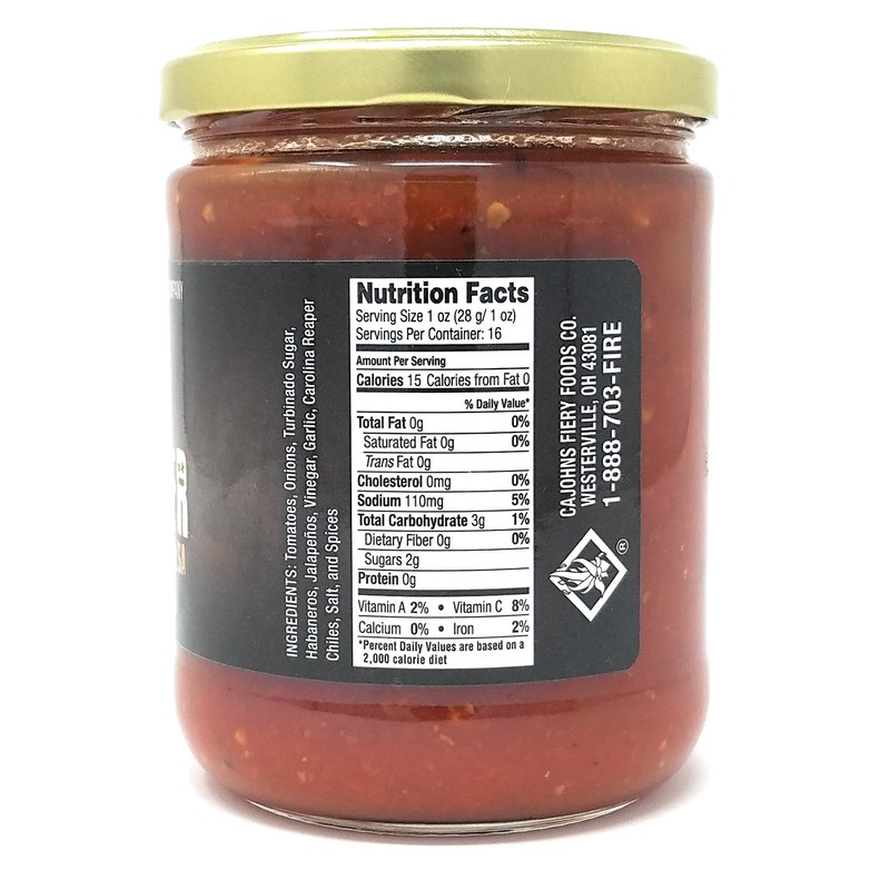 **Ingredients** : Tomatoes, Onions, Turbinado Sugar, Habaneros, Jalapeños, Vinegar, Garlic, Carolina Reaper Chiles, Salt and Spices