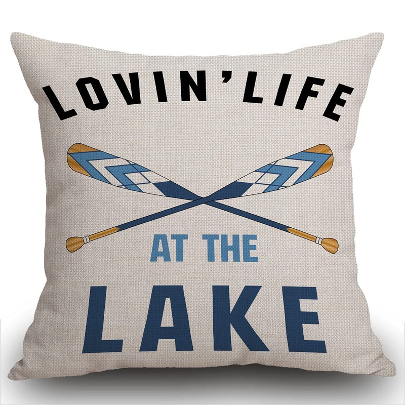 Smooffly Black Blue Word Art Quote Loving Life at The Lake Wooden Paddle Oar Summer Decorative Cushion Cover Throw Pillow Cover Case Home Living Room Bed Sofa Car Cotton Linen Square 18 x 18 Inches