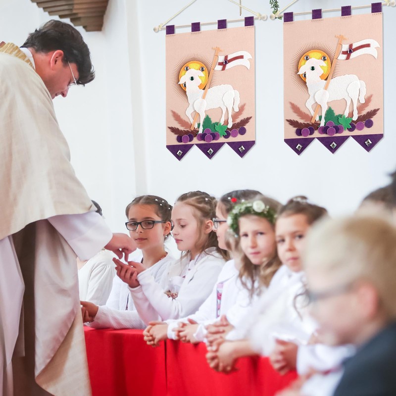 - Lamb Style DIY Kit: our eucharist communion banner kit is lamb-themed, offering a special and fun design, and also includes crystal decoration, ropes, wooden sticks, and small pieces of felt patterns, allowing you to unleash your imagination and assemble it yourself; It is a delightful Catholic craft kit that is fun while teaching the values and essence of First Communion