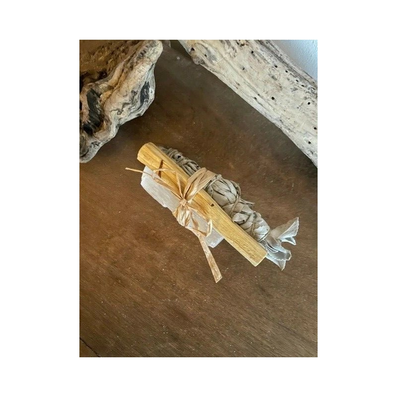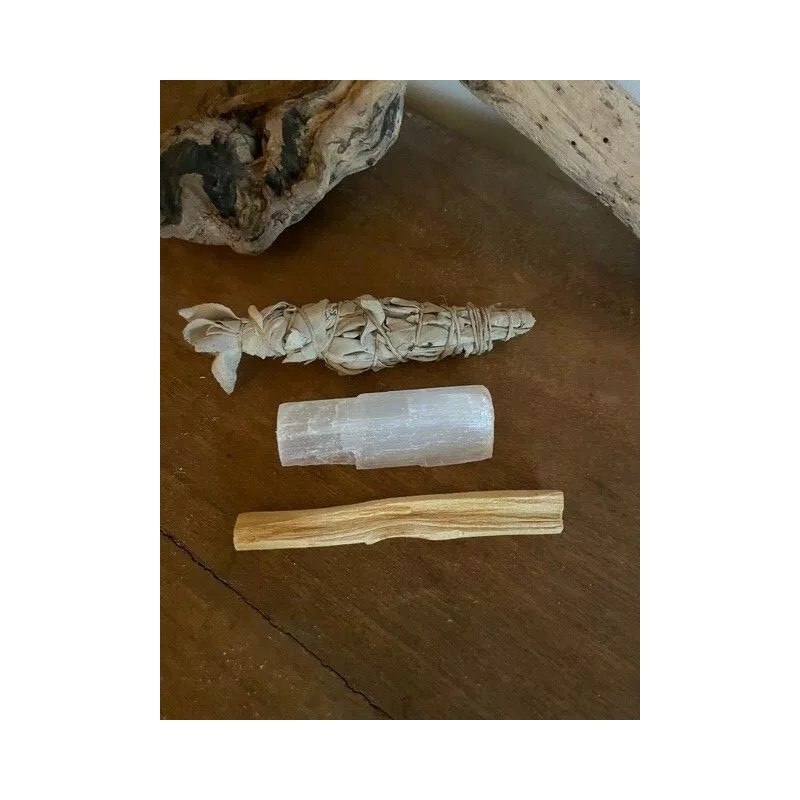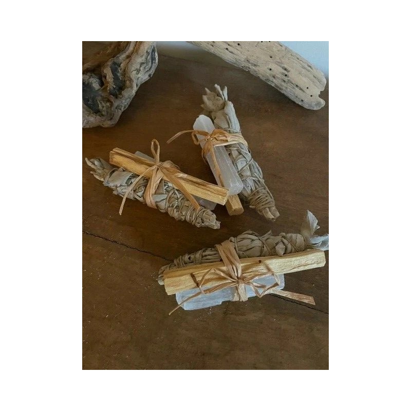 New Handcrafted Wiccan Trio Smudge Kit. Your kit includes:  A hand ties 4" California White Sage Smudge, a 4" Palo Santo Stick and a 3" to 4" Selenite Bar. New All Handmade Items.  Woman owned business in Seattle, WA. visit wiccanmagic.com