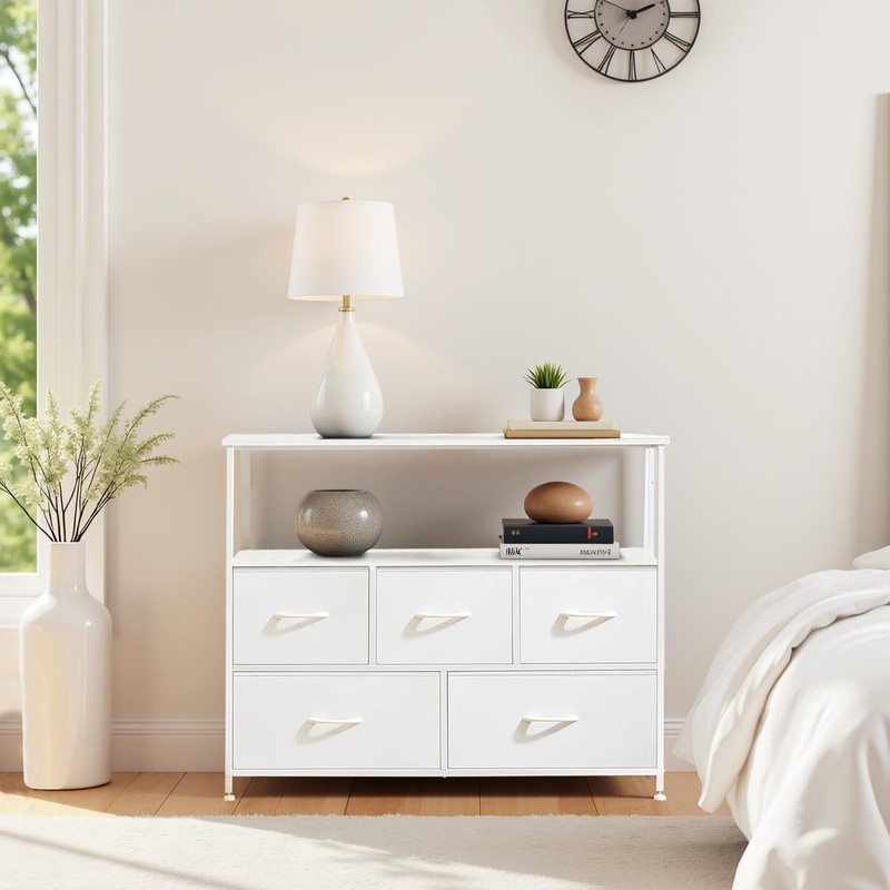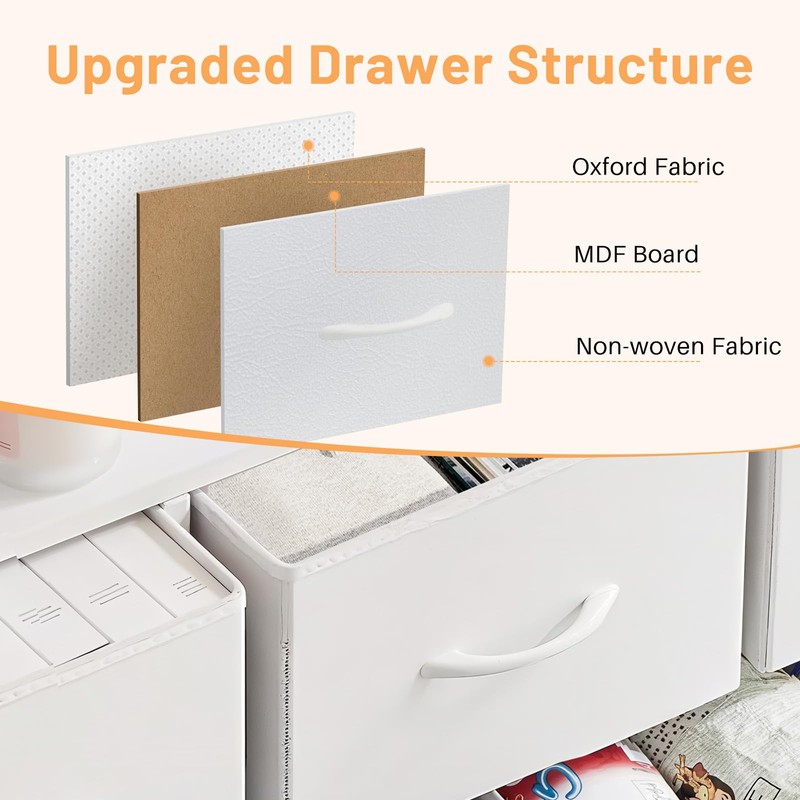 - 5 Spacious Removable Fabric Drawers C Features five lightweight, collapsible storage drawers with easy-pull handles. Great for organizing media accessories, game controllers, DVDs, electronics, and everyday essentials while keeping your space tidy and clutter-free.