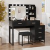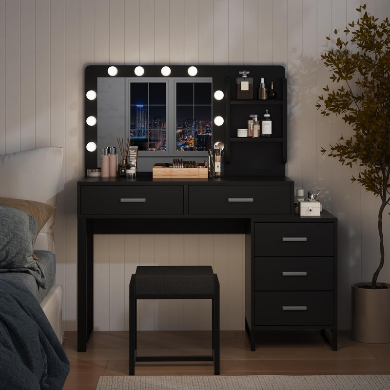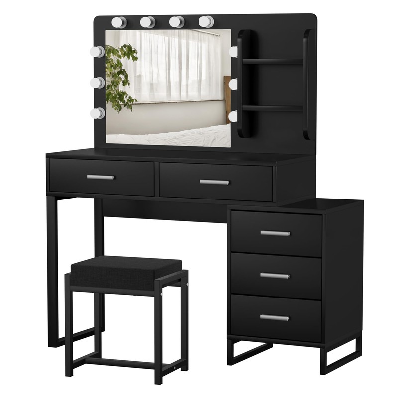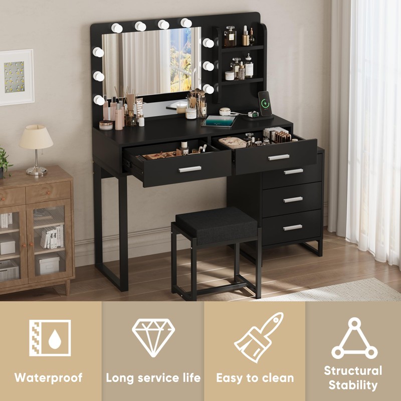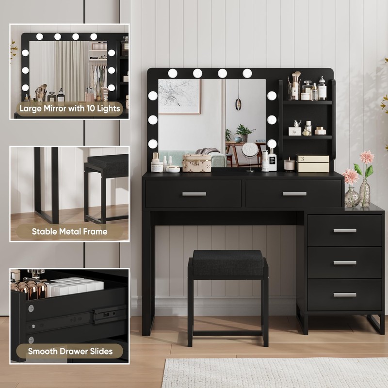 Smuxee Vanity Desk with Mirror and 10 LED Lights, Black Makeup Vanity with 5 Drawers, 3 Lighting Modes Makeup Desk, Madeup Table for Bedroom