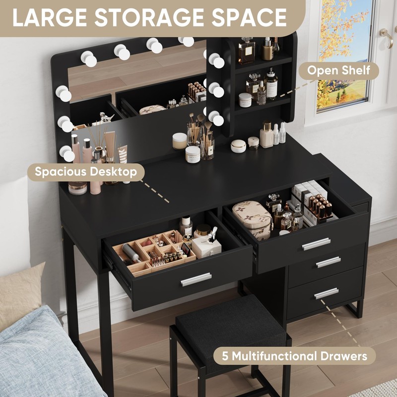 - 【Large Storage Space】The makeup table here has a large top with 5 large drawers and 3 open shelves. Not only can you put down various sizes of cosmetics, but also can accommodate makeup tools, skin care products, etc., so that your makeup table is organized.