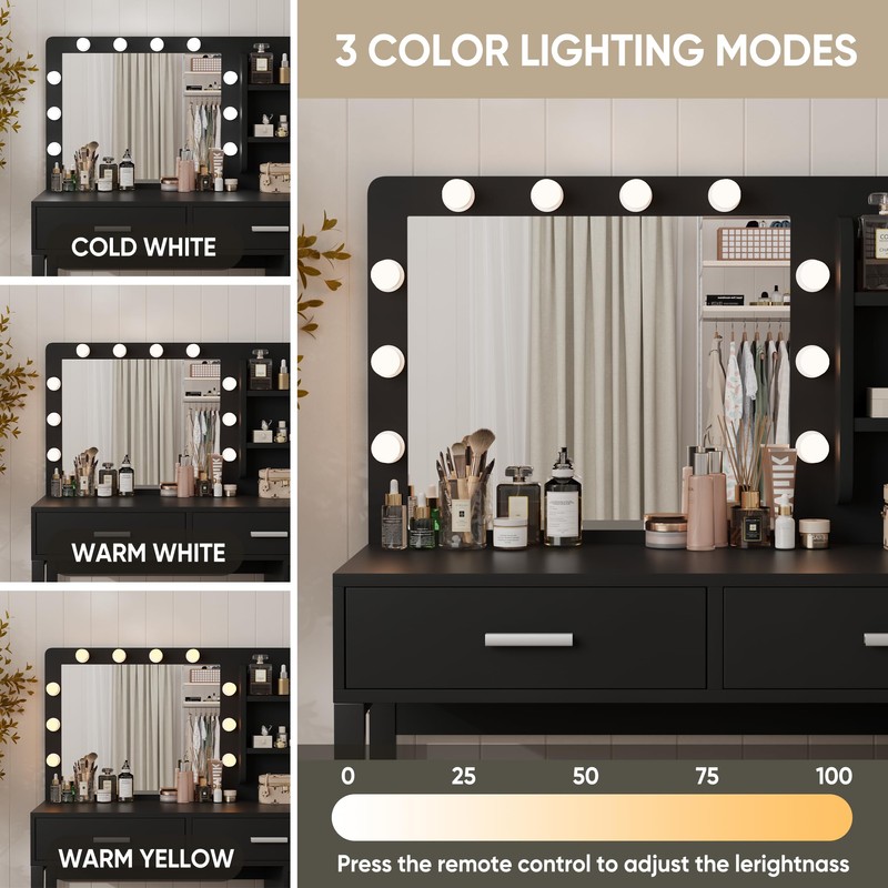 - 【Large Mirror & 3 Colors of Lights】Equipped with a large mirror and 10 three-color and adjustable brightness LED bulbs, this vanity desk is perfectly adapted to any ambient light, creating the most comfortable makeup environment for you to easily put on beautiful makeup.