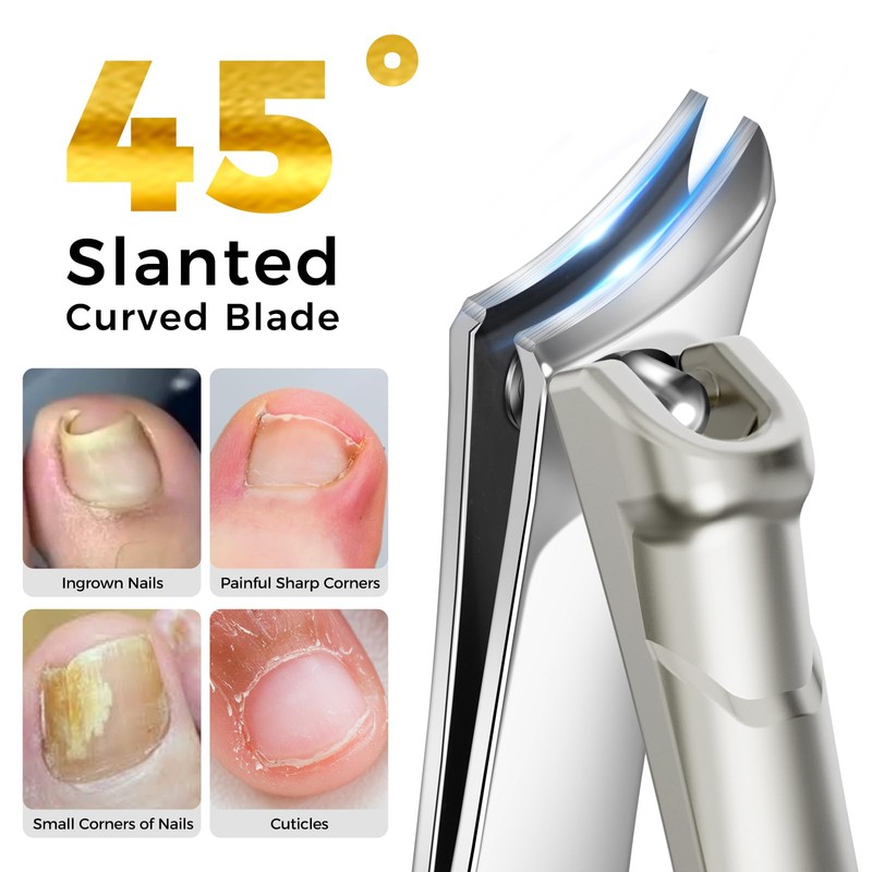 - 45 DEGREES SLANTED NAIL CLIPPERS - With newly upgraded slanted curved jaw design, the curvature of the ingrown toenail clippers is tailored to the shape of natural nails, fitting the curvature of the nails. The sharp tips can accurately trim ingrown toenails, painful sharp corners, small corners of nails, cuticles, flaking skin, etc., ensuring a smooth and efficient trimming process and avoiding injuries when cutting nails