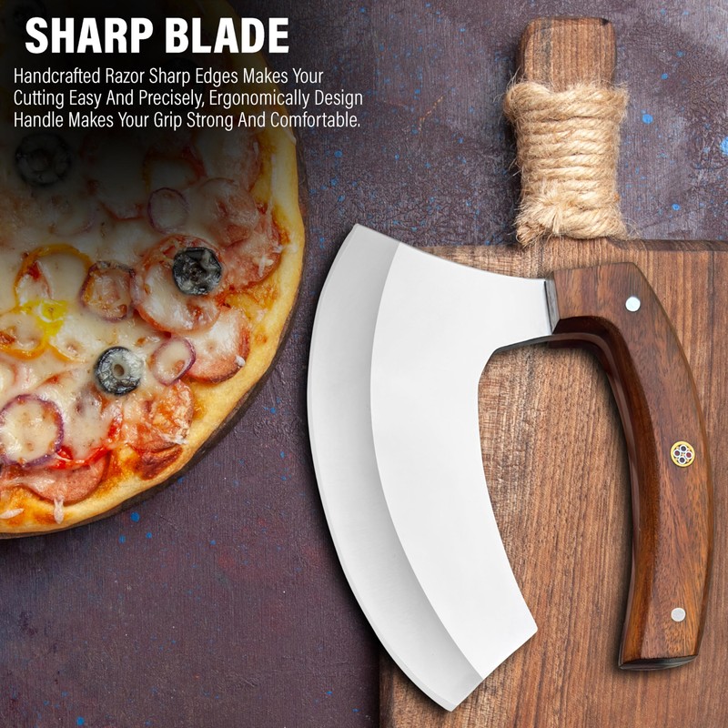 SNA CRAFTS Alaskan ulu knife with sheath - 5” inch Handmade chrome Steel ulu knives - Perfect Pizza cutter rocker knife for chopping, mincing and slicing - wooden handle