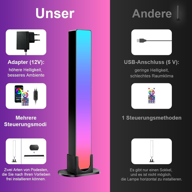 - EINFACHE INSTALLATION : Die intelligente LED-Lichtleiste kann vertikal oder horizontal installiert werden. Wir sind mit einem Magnetfu? ausgestattet, um die Stabilit?t zu gew?hrleisten. Sie k?nnen das Licht im gewnschten Winkel platzieren, die intelligente LED-Leiste kann direkt in die Stromquelle eingesteckt und in Innenr?umen verwendet werden, wenn es eine Stromquelle gibt, kann es jederzeit verwendet werden.