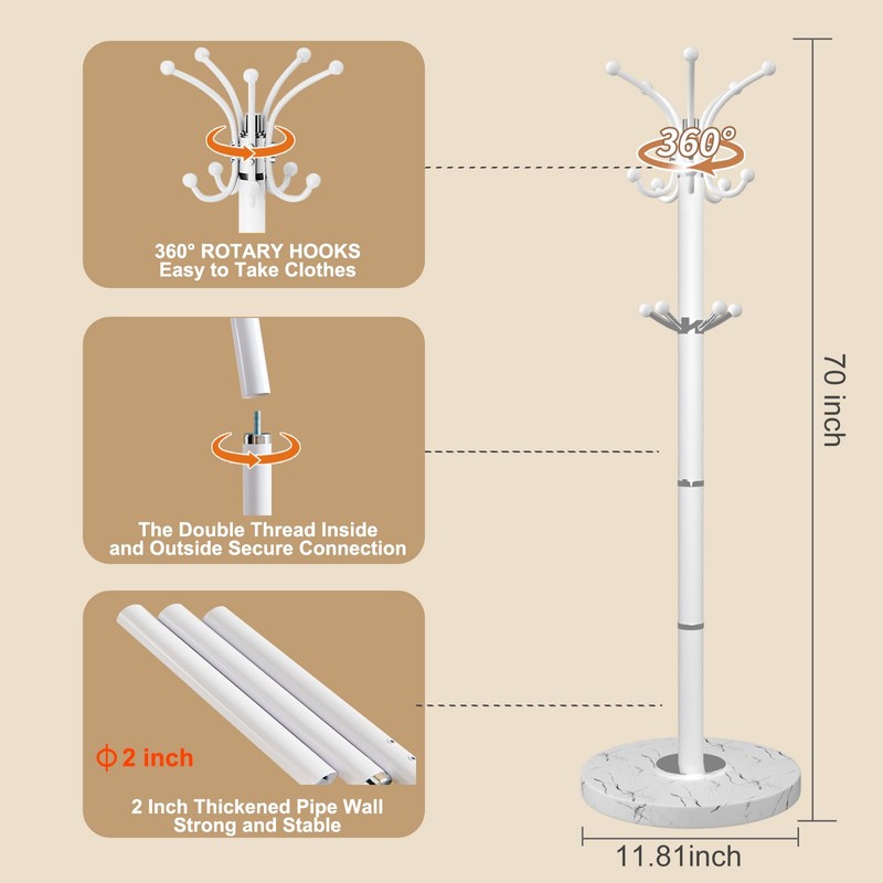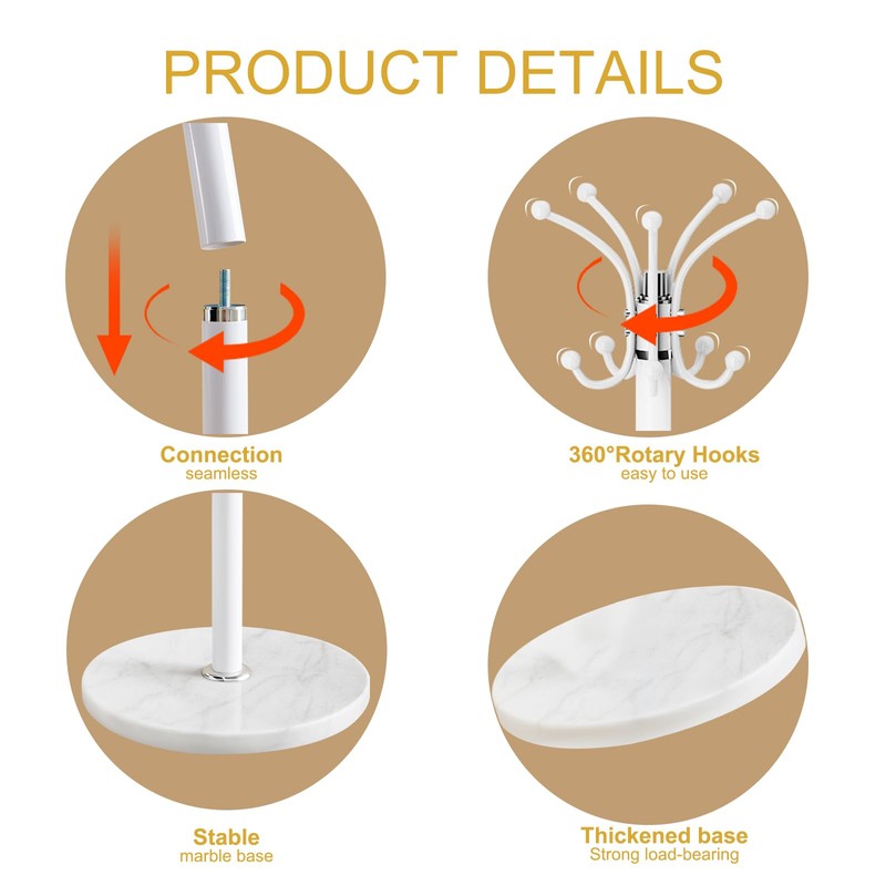 - NATURAL MARBLE BASE: SNAIKOR white coat rack freestanding base stand is made of natural marble. Every piece of marble is carefully selected, and the natural texture on it comes from the carving of nature. The diameter of marble is 11.81 inches, which is stable and without shaking