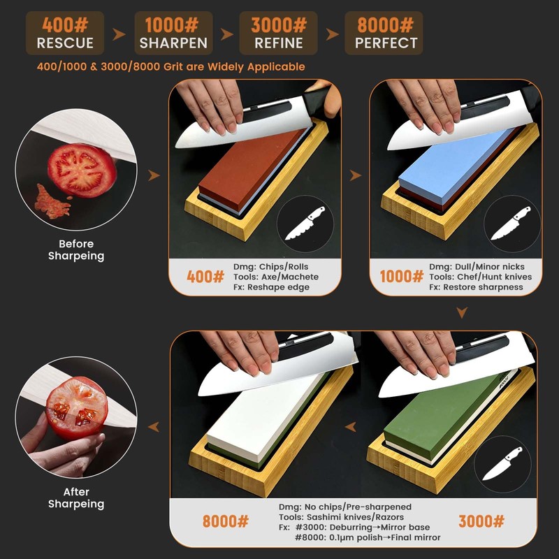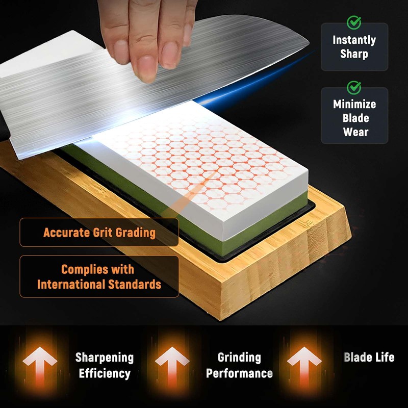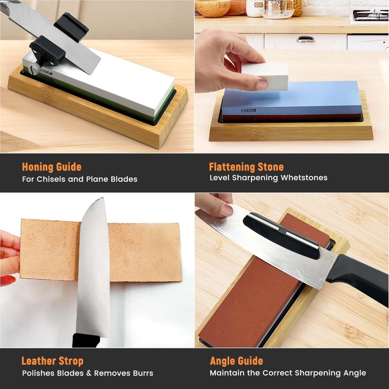 • 【Non-Slip Bases & Angle Guide – Safe & Accurate】 The Bamboo & Silicone Bases prevent slipping for secure sharpening. The Angle Guide helps maintain the perfect edge for knife sharpening stone kit, chisels, and plane blades