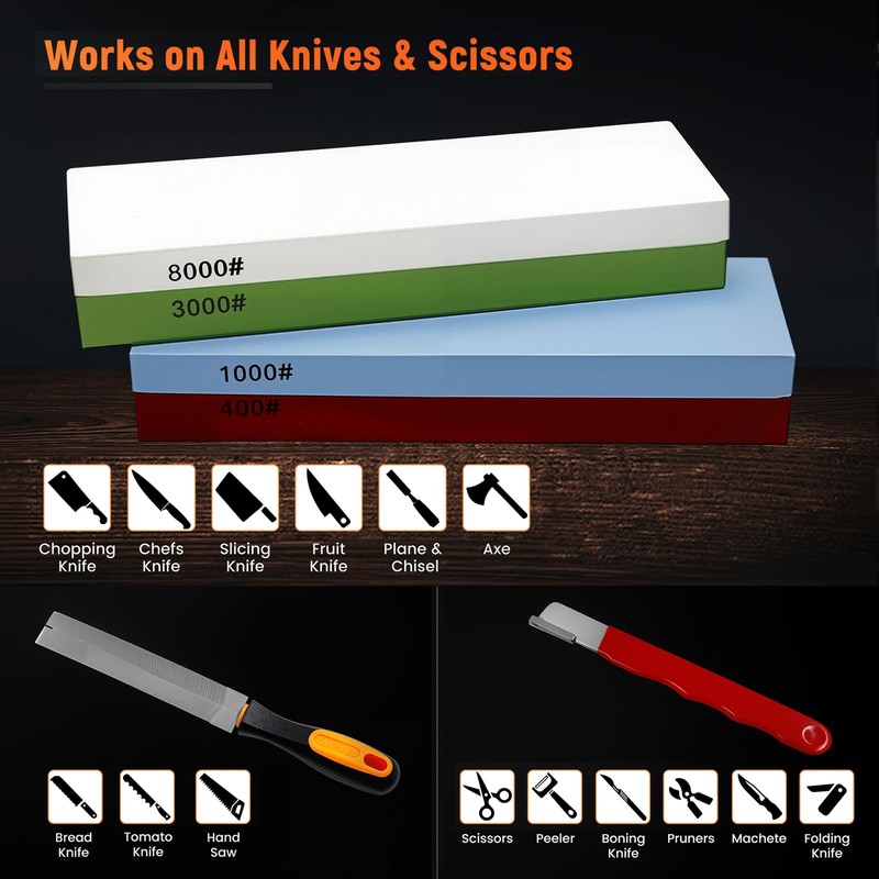 • 【10-Piece Complete Knife Sharpening Kit】 Everything you need for razor-sharp blades! Includes 2 dual-sided whetstones (400/1000 & 3000/8000 grit), a Red Knife Sharpener (portable rapid-grinding tool), Metal File (perfect for serrated knives), Flattening Stone, Leather Strop, Bamboo Non-Slip Base, Silicone Base, Honing Guide, and Angle Guide