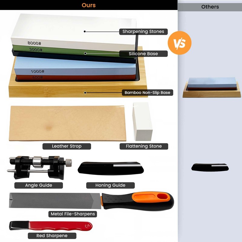 This knife sharpening kit includes: 2 dual-sided whetstones (400/1000 & 3000/8000 grit), a Red Knife Sharpener, Metal File, Flattening Stone, Honing Guide, Leather Strop, Bamboo Non-Slip Base, Silicone Base, and Angle Guide