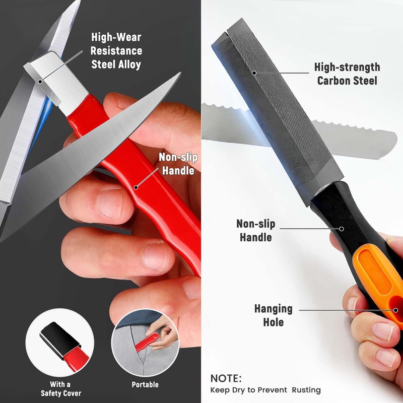 • 【Red Knife Sharpener & Metal File – Fast & Precise】 The Red Knife Sharpener Stone Kit offers portable rapid grinding. The Metal File expertly sharpens serrated knives, ensuring no edge is left dull. Perfect for kitchen, hunting, and pocket knife sharpener use