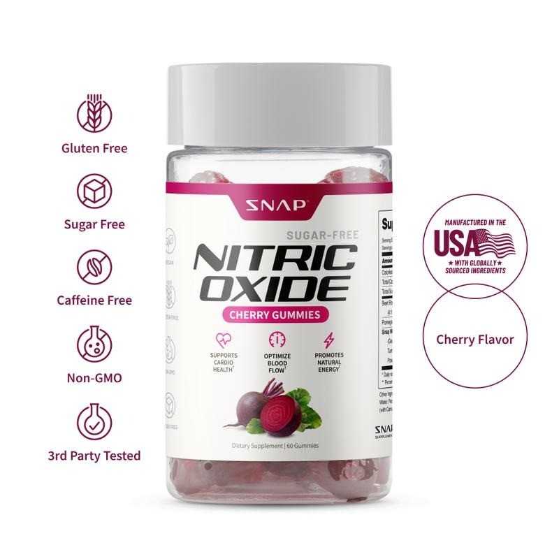 Snap Supplements Nitric Oxide Gummies: Fuel Your Heart, Boost Energy & Support Digestion! 💓 Supports Cardiovascular Health – Packed with the combined power of antioxidants and nitric oxide, our Nitric Oxide Gummies support healthy circulation and blood flow, promoting optimal heart health.* 🍓 Daily Nutrition Boost – With a blend of nutrient-rich fruits and vegetables, these gummies provide a broad spectrum of vitamins and minerals, offering the energy and vitality you need to feel your best every day.* 🌱 Supports Healthy Digestion – Featuring phytonutrients from turmeric, beets, kale, and broccoli, our gummies assist in natural detoxification and support healthy liver function, ensuring your body runs smoothly from the inside out.* ⚡ Supports Energy & Vitality – Infused with extracts of green coffee bean and green tea, our gummies offer a gentle energy boost, helping you power through the day and stay vibrant during your workouts! ✅ Made in an FDA-approved facility 🔬 Third-party tested for potency & purity 🌱 Non-GMO, gluten-free, and vegan-friendly 🇺🇸 Proudly made in the USA Key Ingredients in Nitric Oxide Gummies:·Organic Beetroot – Rich in dietary nitrates and antioxidants, beetroot supports healthy blood pressure, improves circulation, and helps with digestion while protecting cells.*·Pomegranates – Packed with antioxidants, pomegranates protect against oxidative stress and support heart and brain health, helping enhance your longevity and overall well-being.*·Blueberry Powder – Known for promoting a healthy gut microbiota and high antioxidant content, blueberries support digestive health and cellular protection.*·Green Coffee Bean & Green Tea – Energizing extracts that boost energy production, improve focus, and combat stress, ensuring you have the stamina for your active lifestyle.* Directions:Take 2 gummies daily, or as directed by your healthcare professional.Serving Facts:Each bottle contains 30 servings (30-day supply). FAQ:How do Nitric Oxide Gummies support heart health? The antioxidants and nitric oxide in the gummies support healthy blood circulation and blood pressure, promoting overall cardiovascular wellness.*Can these gummies help with energy? Yes! The combination of green coffee bean and green tea extracts gives you a natural, gentle energy boost without the crash, helping you stay focused and active throughout the day.*What other benefits do the ingredients provide? Our gummies are packed with powerful ingredients like pomegranates and beetroot, which offer antioxidant protection and support healthy digestion, liver function, and blood pressure.* Safety Information:Consult with a healthcare provider before use if you are pregnant, nursing, or taking medications.† These statements have not been evaluated by the Food and Drug Administration. This product is not intended to diagnose, treat, cure, or prevent any disease.