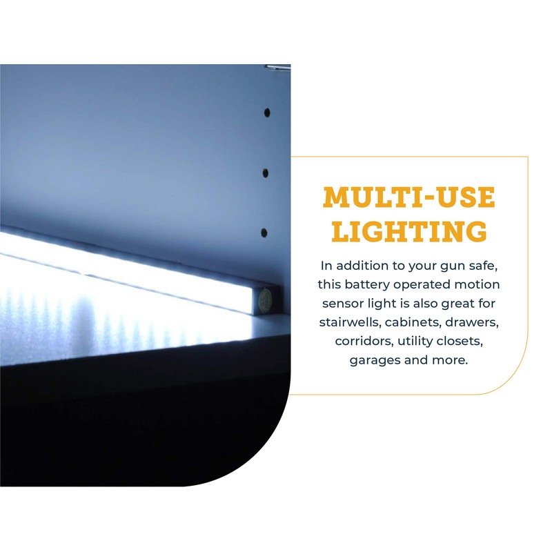 - Use Almost Anywhere – In addition to your gun safe, this battery operated motion sensor light is also great for stairwells, cabinets, drawers, corridors, utility closets, garages and more