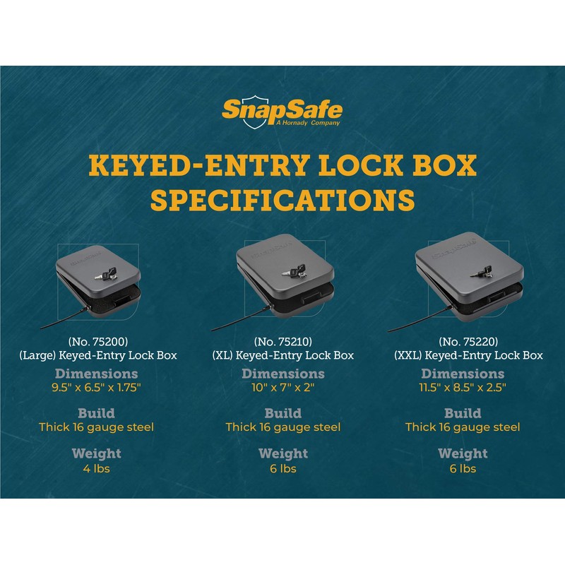 - Heavy Duty and Sturdy Security Safe Box – SnapSafe Lock Boxes feature heavy duty 16 gauge housing and include a 1500 lb. rated cable for securing to stationary objects at home or in your vehicle. Available in 3 sizes - Large, XL and XXL