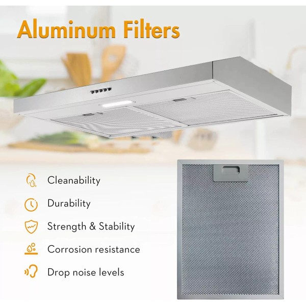 Stainless steel under cabinet range hood, brings a stylish and modern appearance to fit your kitchen decors. 30 inch size, suitable for a variety of kitchen spaces.